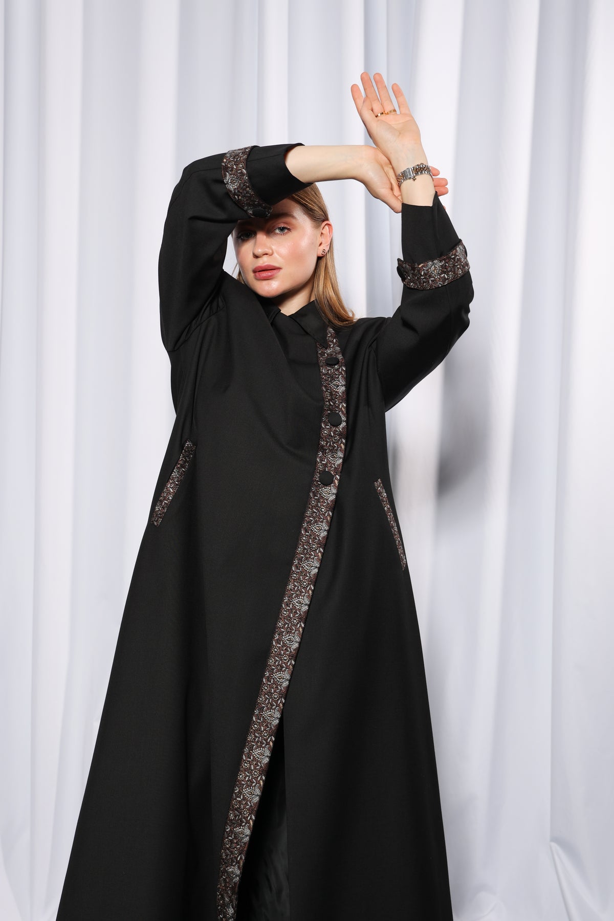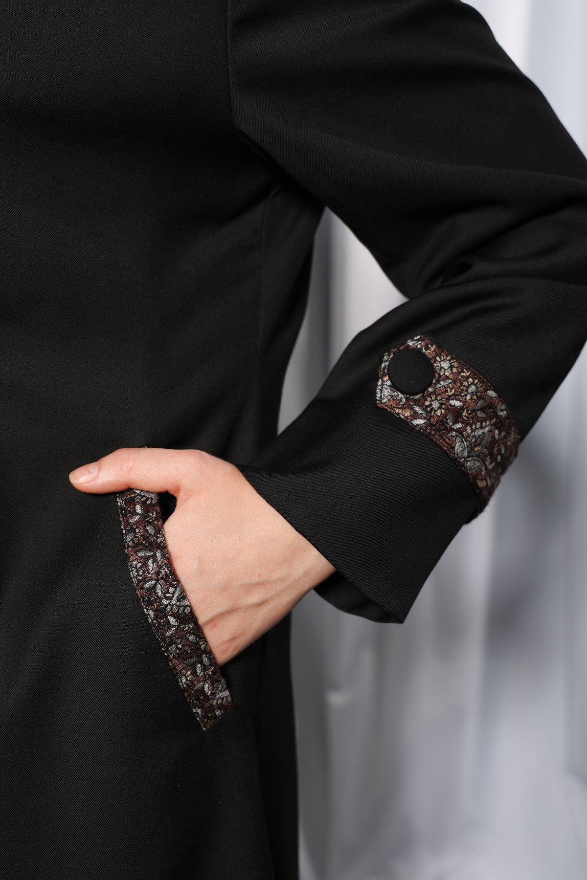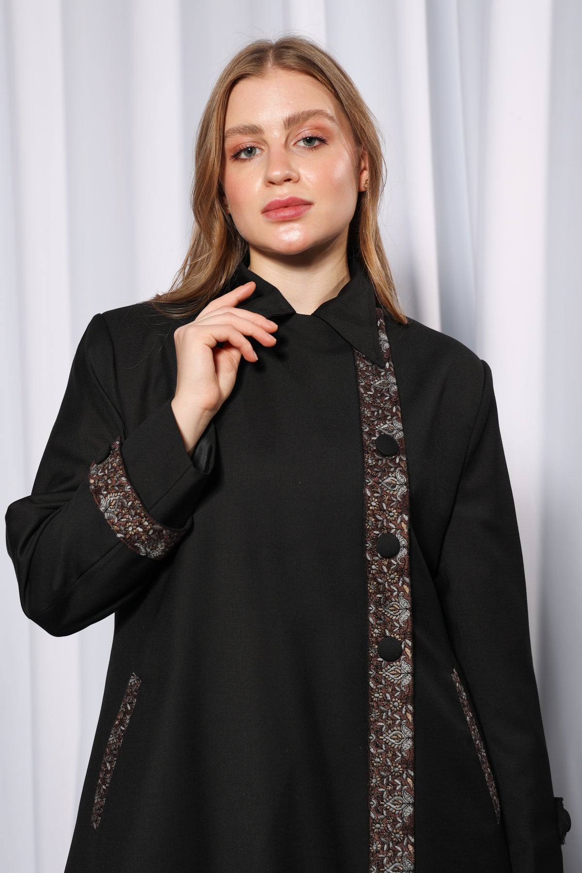 The structured collar offers a clean, sophisticated look, while the decorative vertical trim is complemented by statement buttons along the front panel for added detailing. Coordinated patterned accents on the sleeve cuffs further elevate the design, creating a cohesive and luxurious aesthetic.