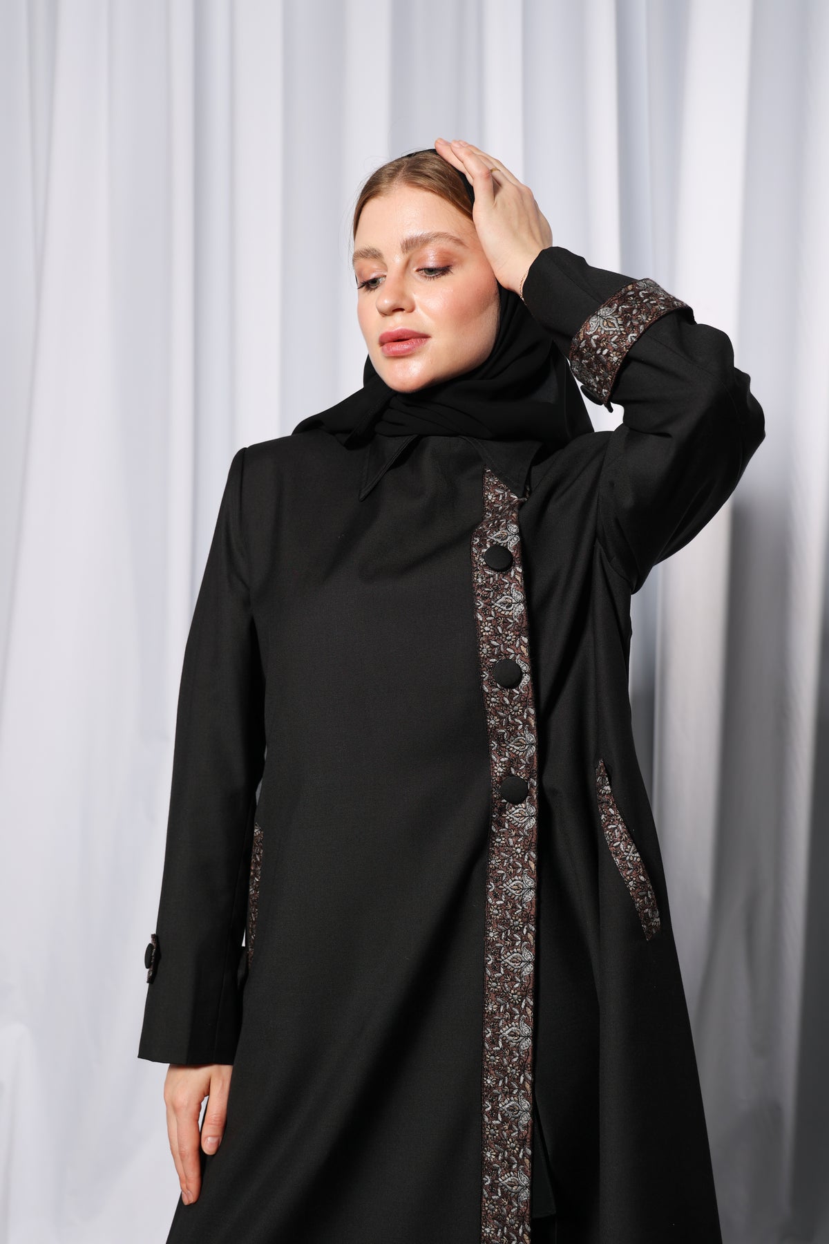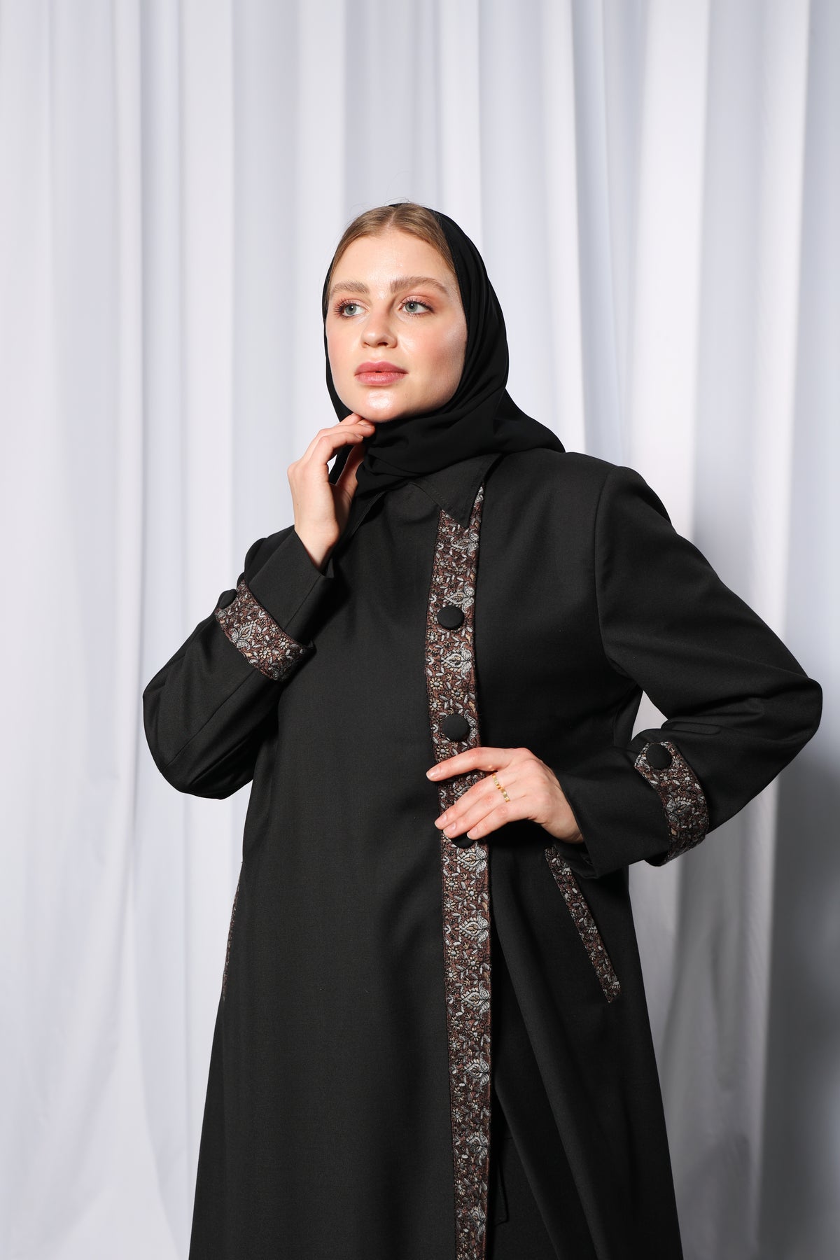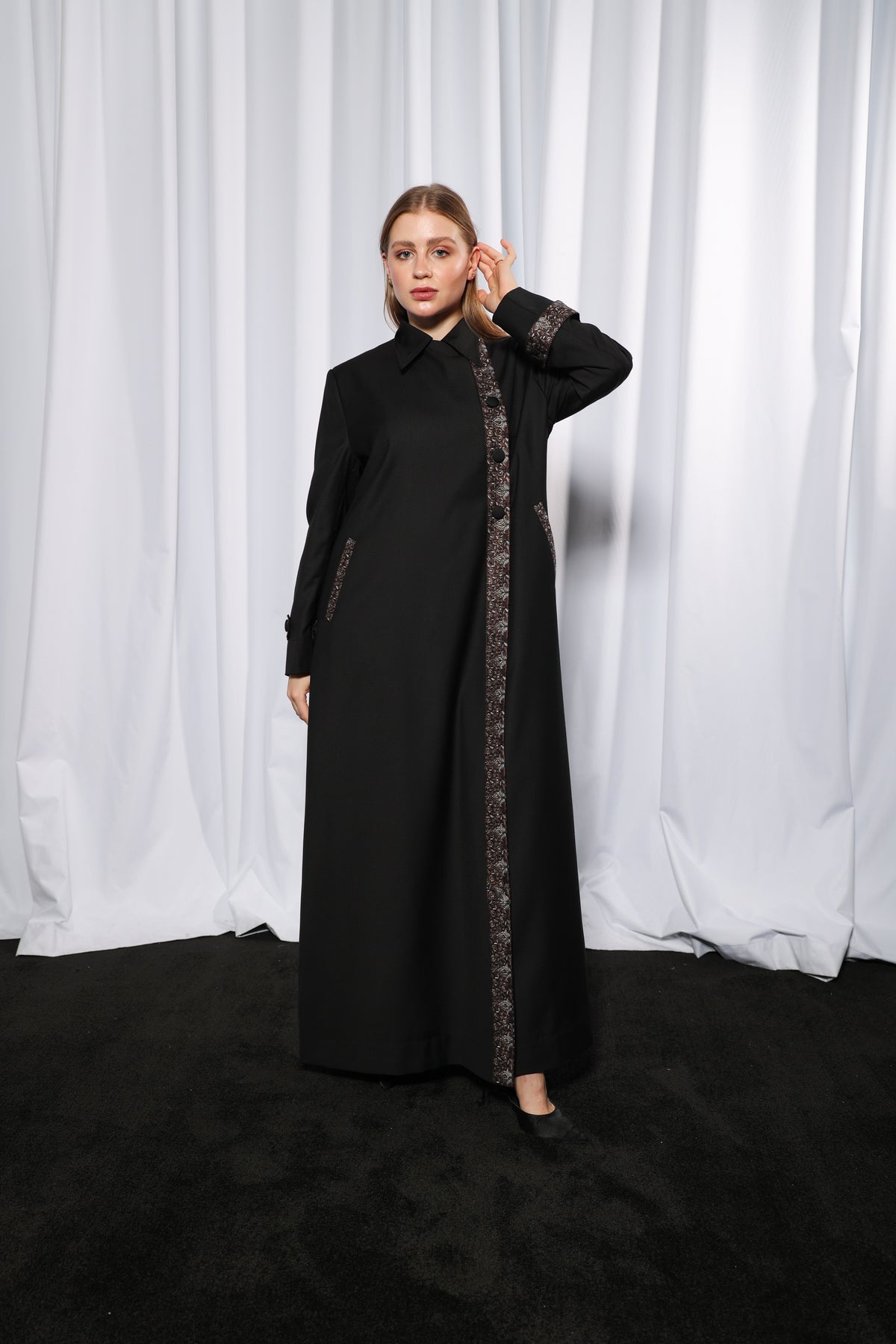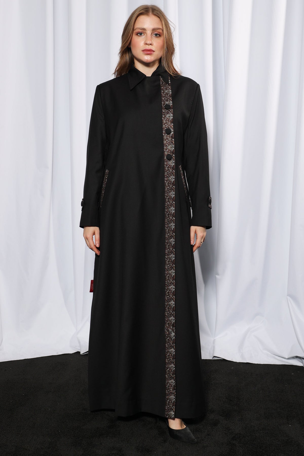 This design features a defined overlapping panel, allowing versatile styling while ensuring modest coverage. enhances ease of movement and flow without compromising elegance, giving the abaya a modern tailored finish.