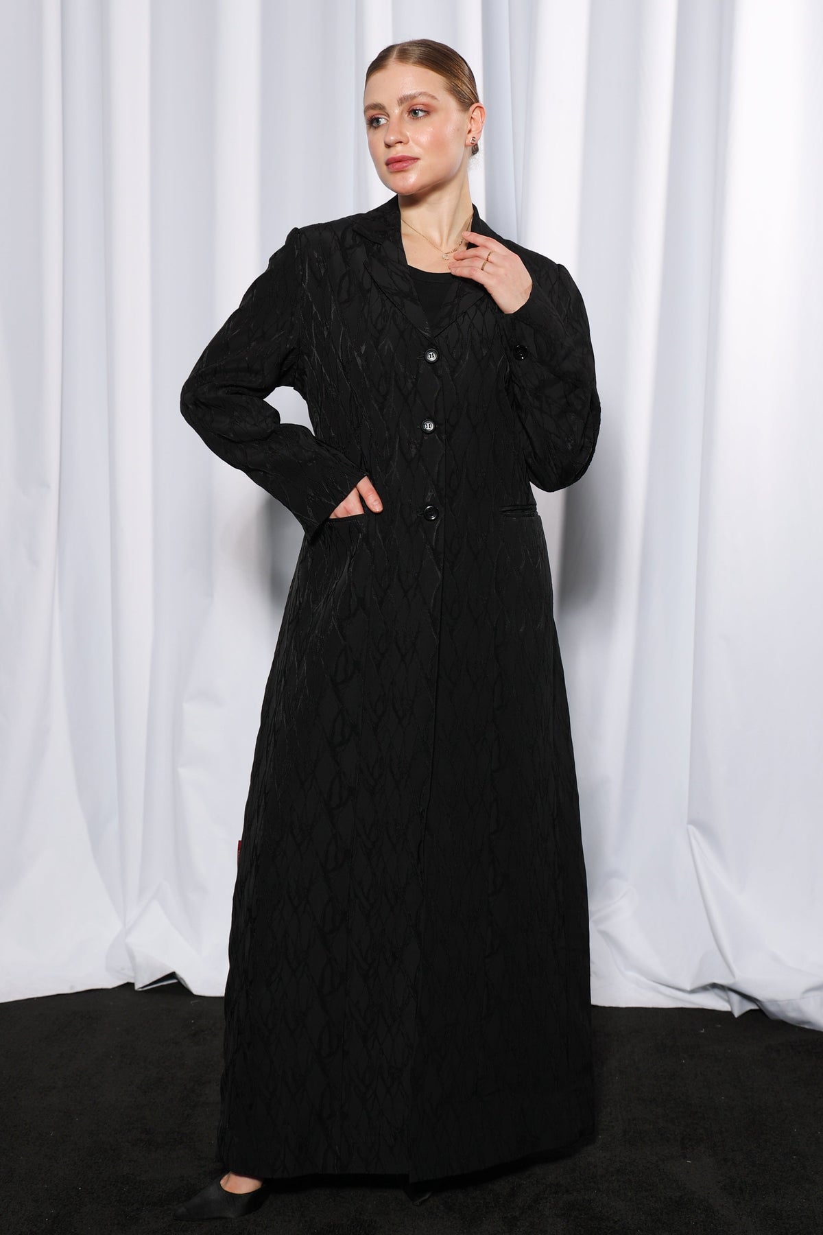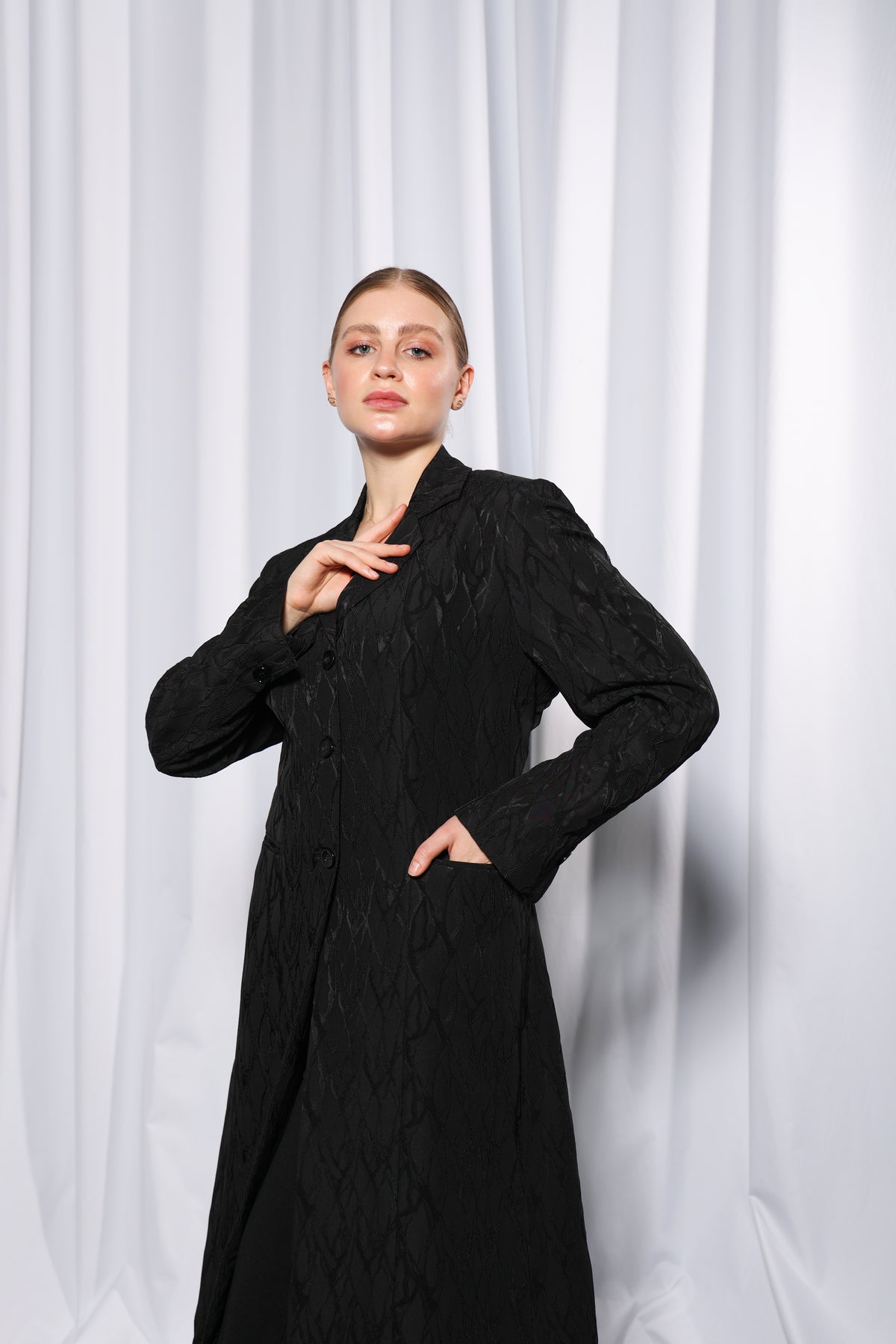 Elevate your modest wardrobe with this luxury textured black blazer abaya by Esmeabaya, designed for women who appreciate structured tailoring and contemporary elegance.