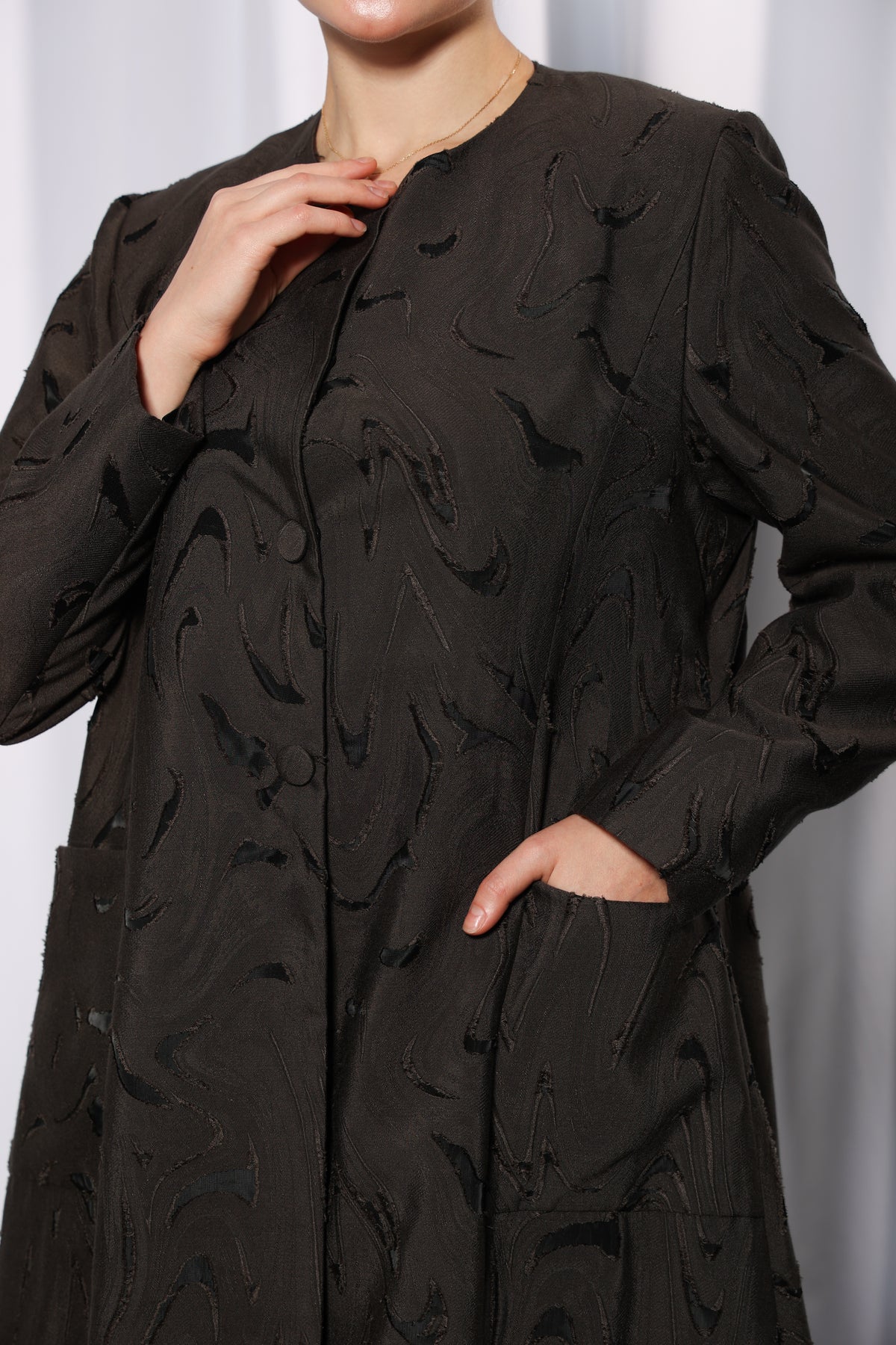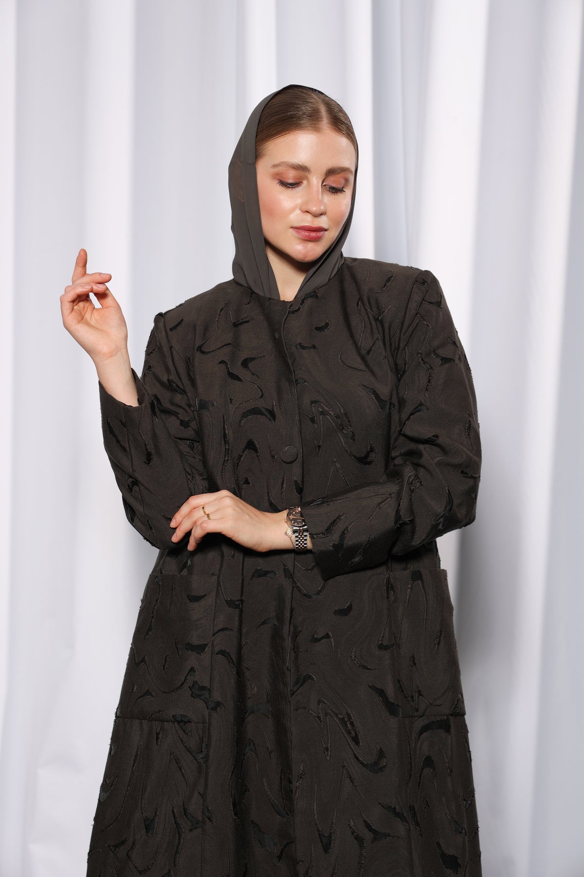 Perfect for women in Doha and across Qatar seeking a premium brown abaya that blends classic modesty with modern texture and structure.