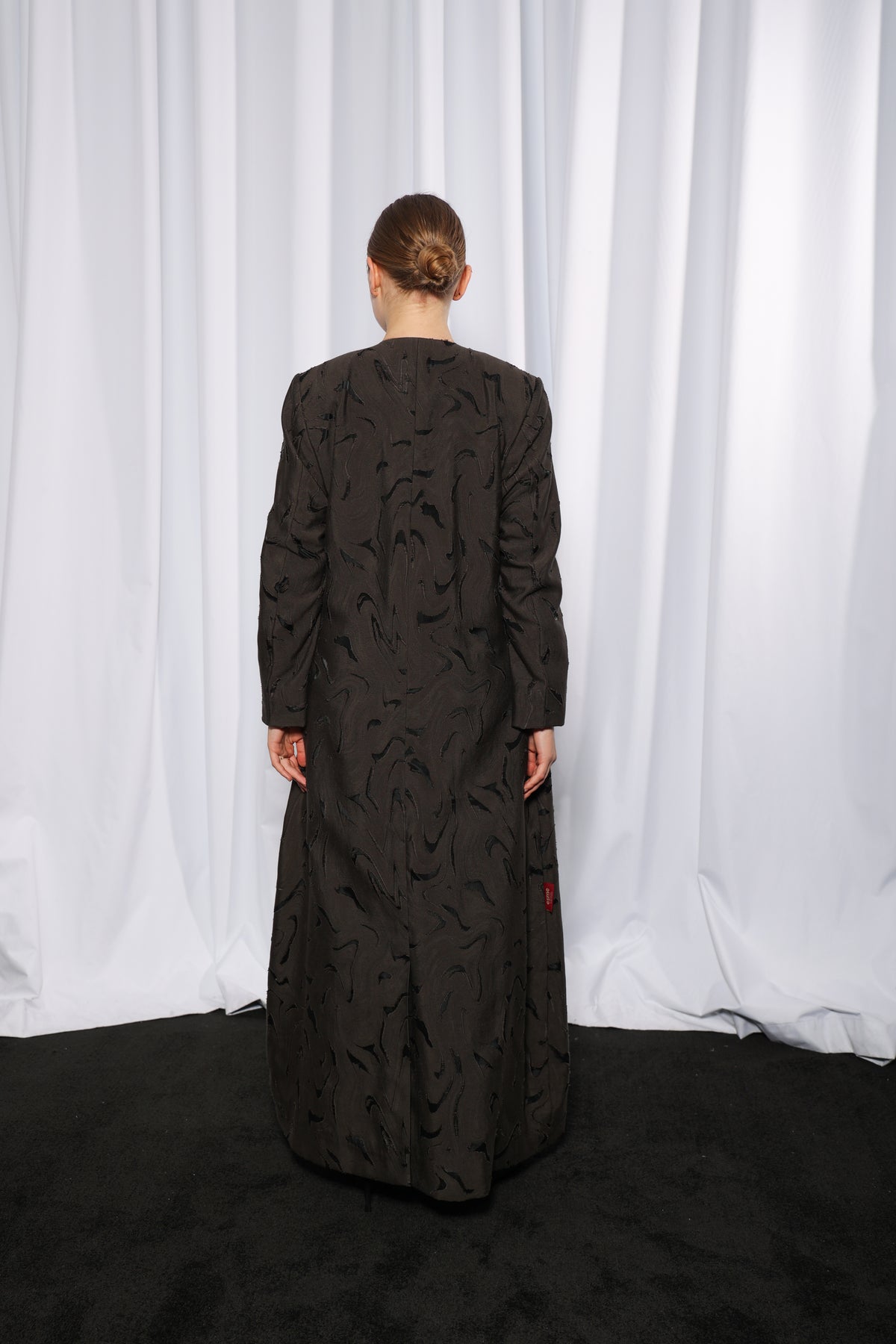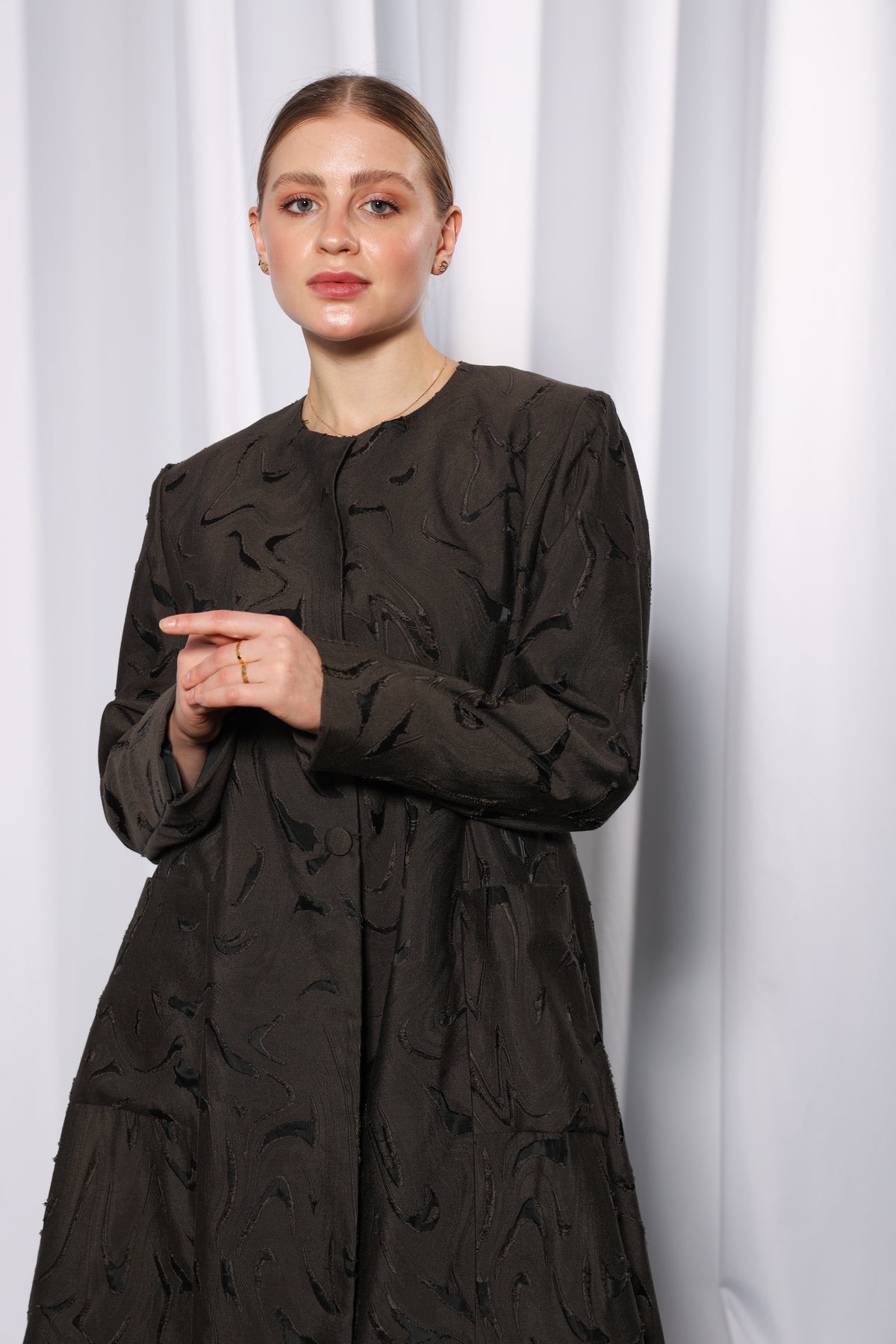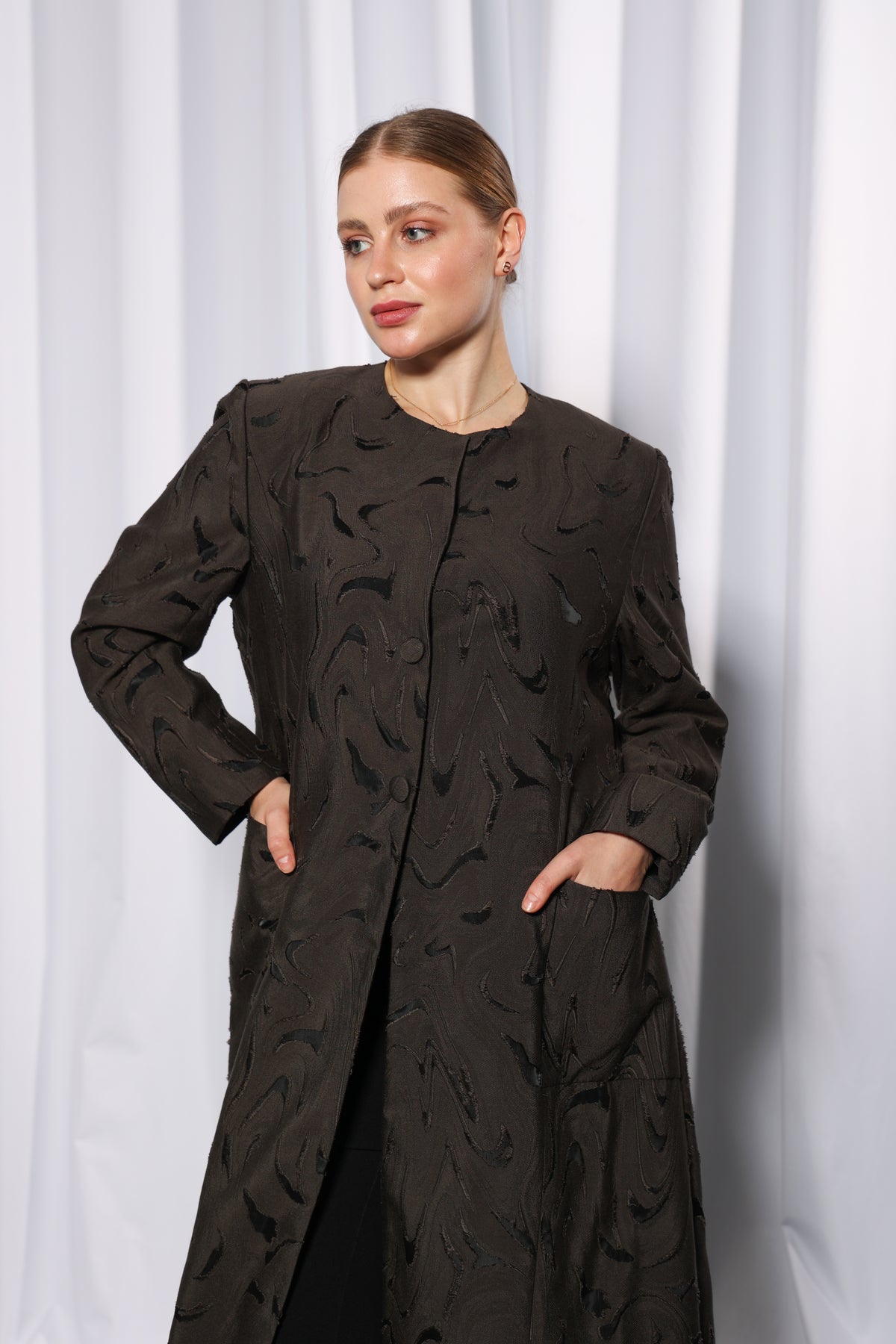 This design features a front-open cut with a clean overlapping front panel, offering full modest coverage while allowing effortless layering over inner dresses or tailored trousers. The structured yet relaxed silhouette provides both comfort and polish.