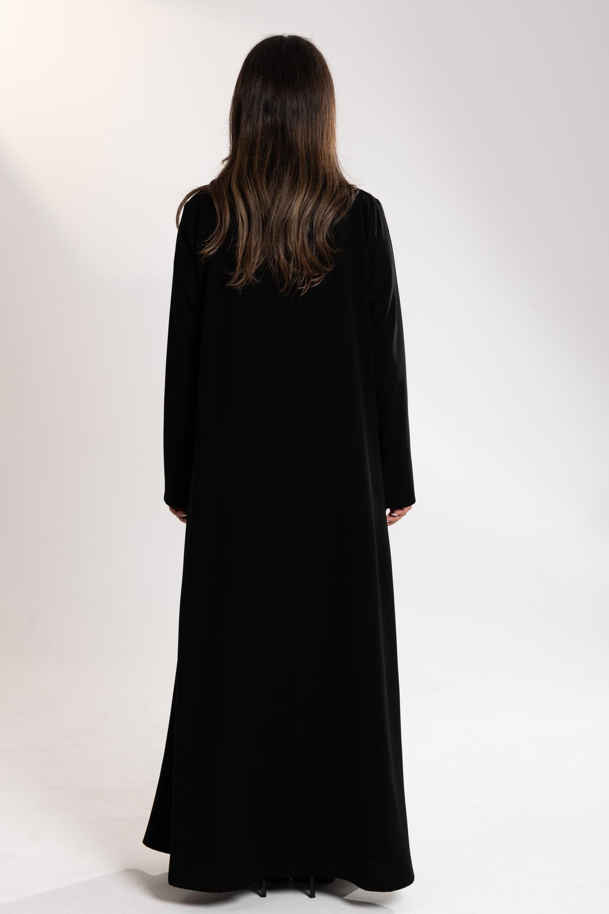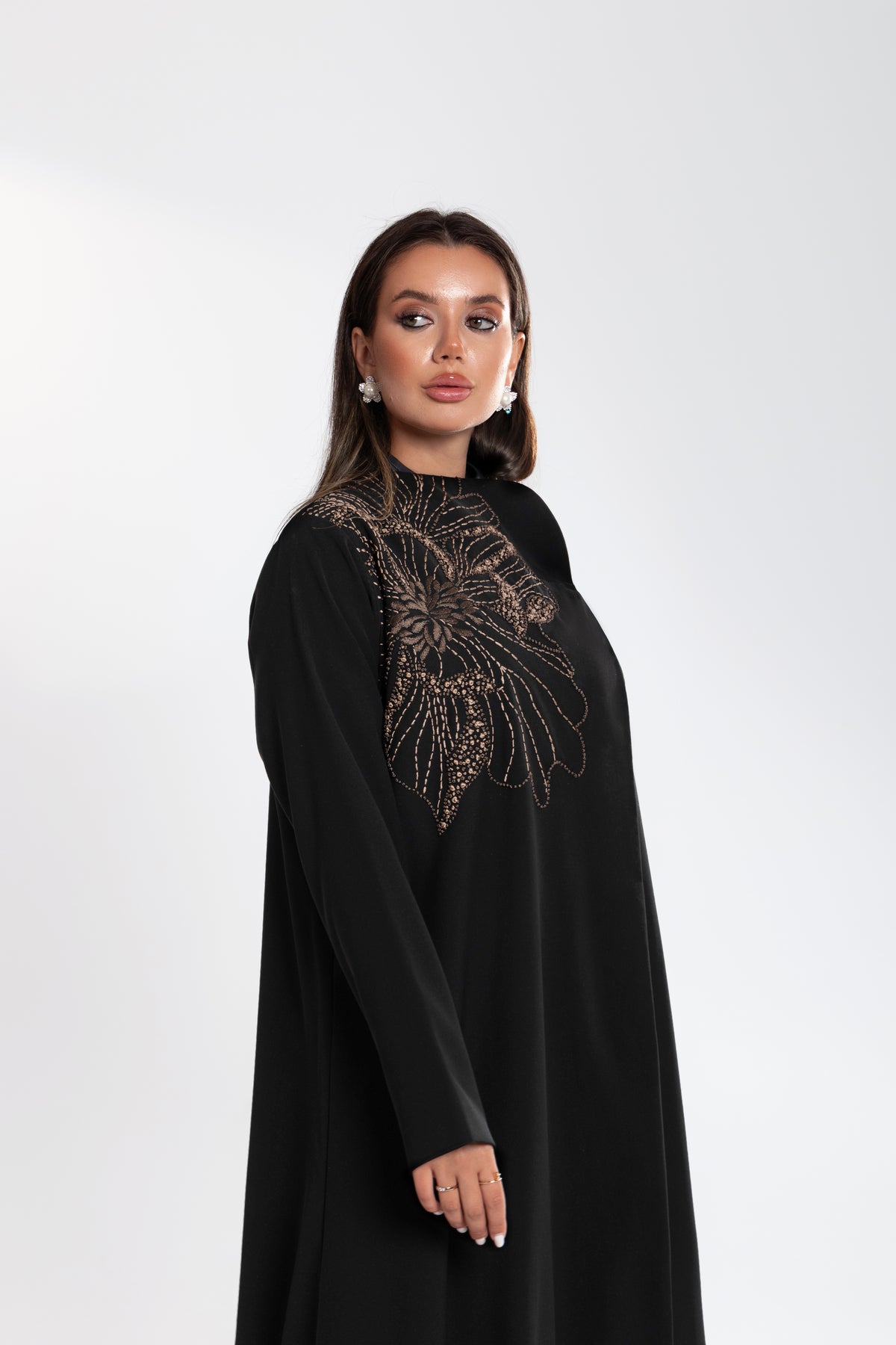 The Esme Art Stitch Abaya is a black masterpiece adorned with delicate hand embroidery on one shoulder, featuring rich tones of light and dark brown. The contrast of subtle color and fine stitching creates a sophisticated, artistic statement — an ode to craftsmanship and timeless elegance.