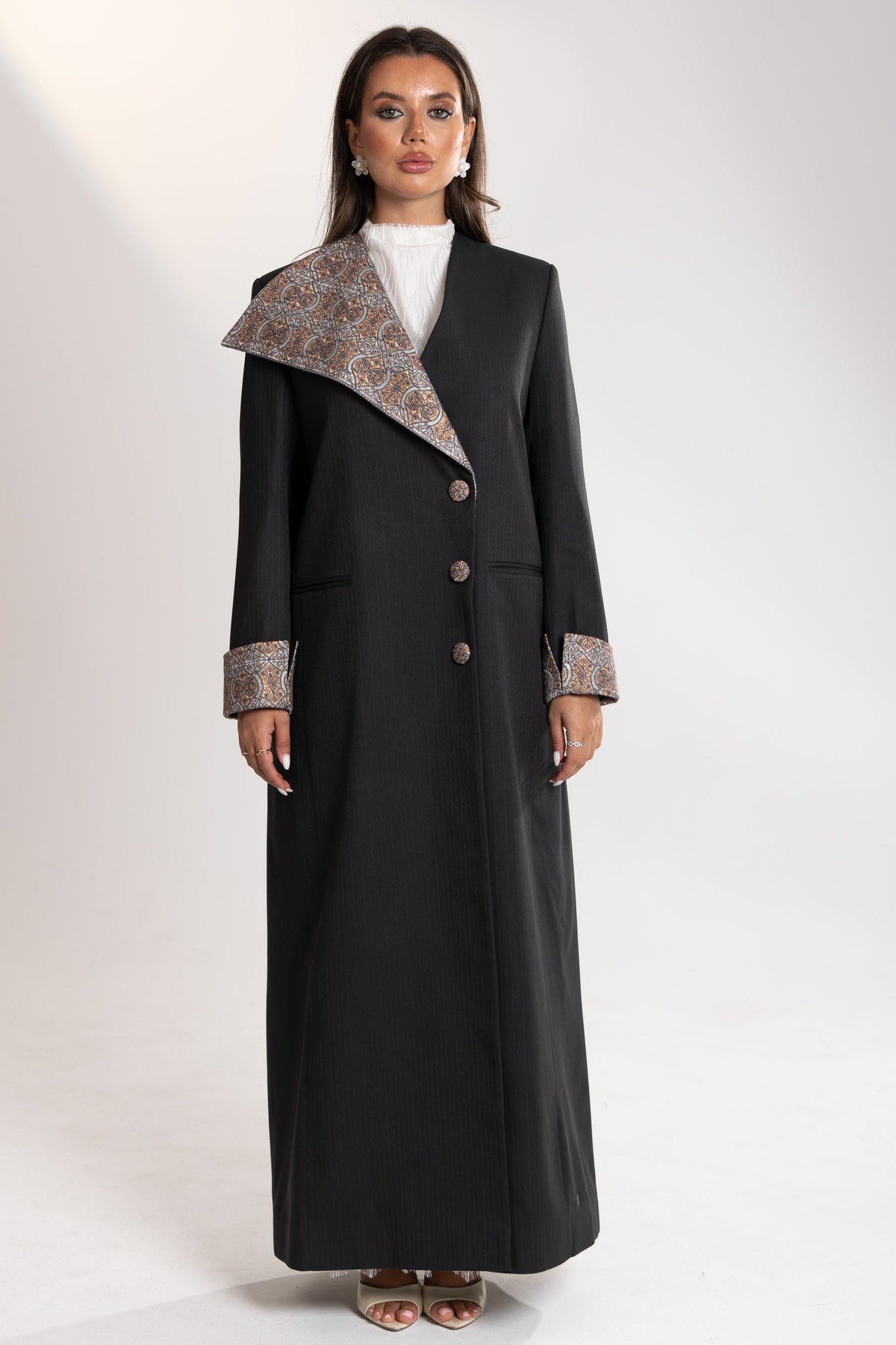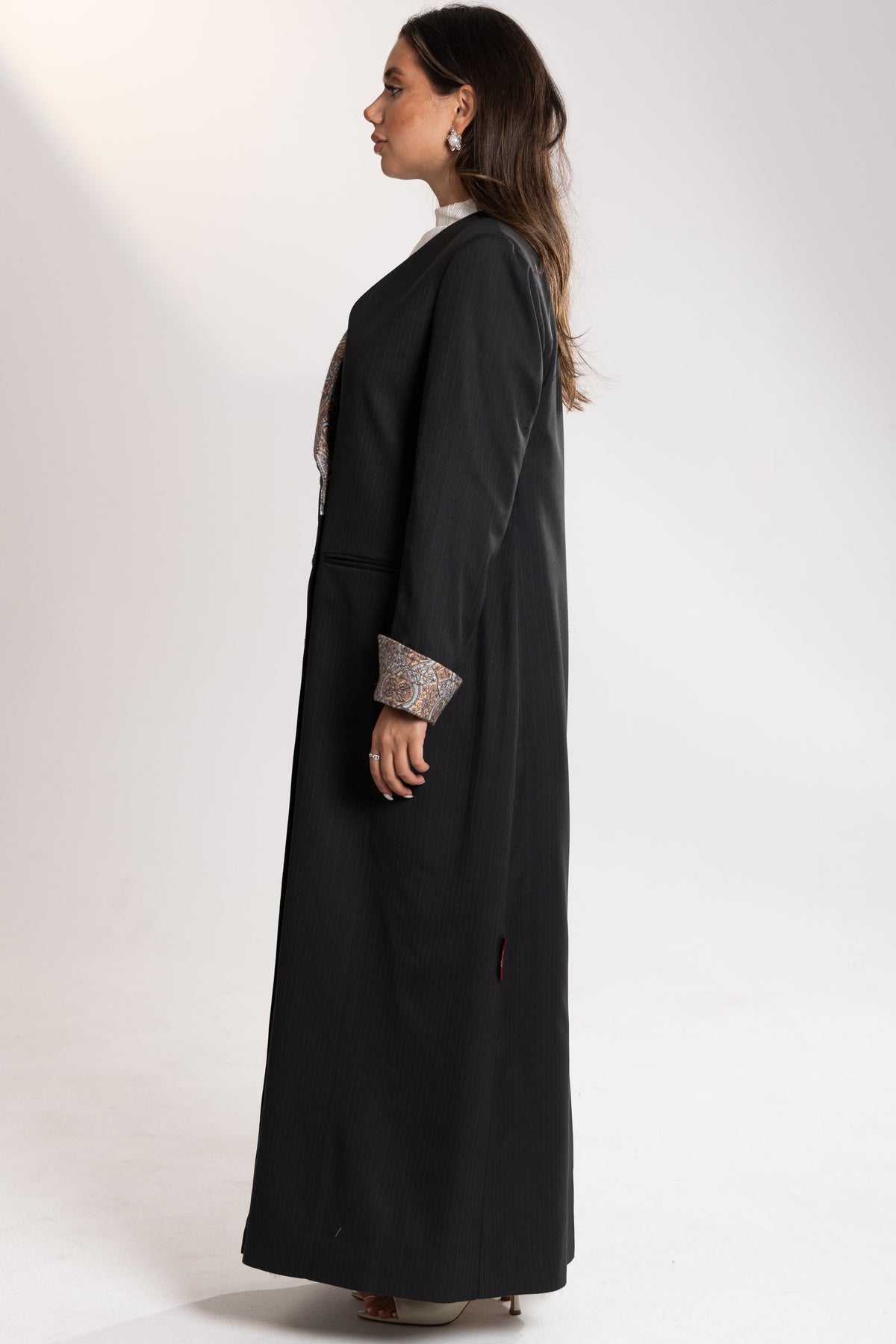 The Esme Diwan Abaya is crafted with intricate Kashmiri embroidery, merging cultural artistry with modern sophistication. Designed with a structured blazer silhouette, it radiates elegance, strength, and refined power, making it the perfect choice for special occasions and statement moments.