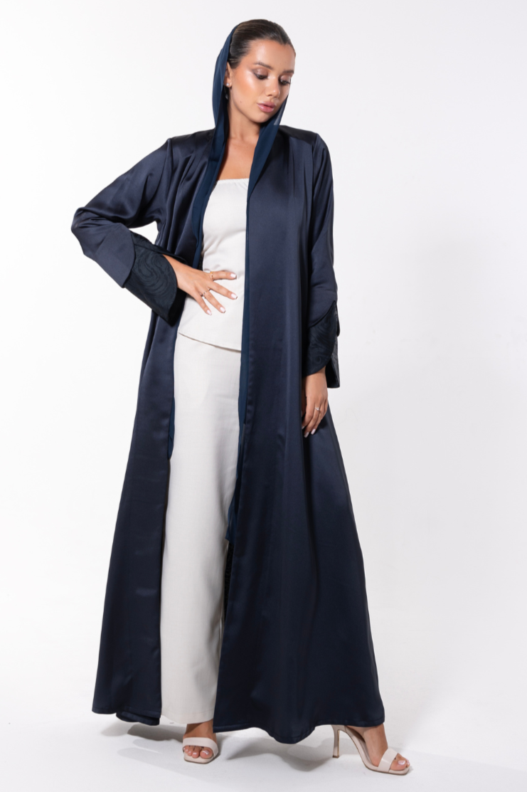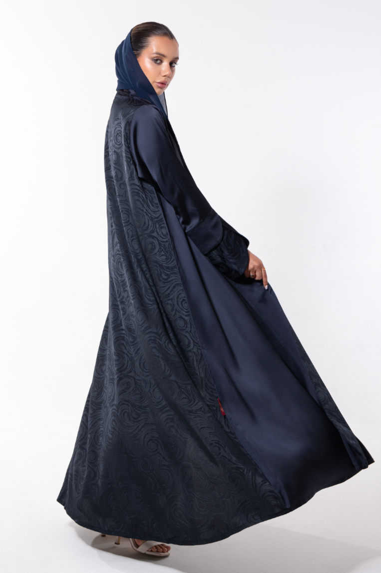 Split Harmony is where contrast finds balance , a bold, artistic abaya that plays with dual textures to create an effortlessly refined look. With a soft blue base and a subtly shimmering panel flowing along one side, this piece is designed to elongate the silhouette and add graceful motion with every step.