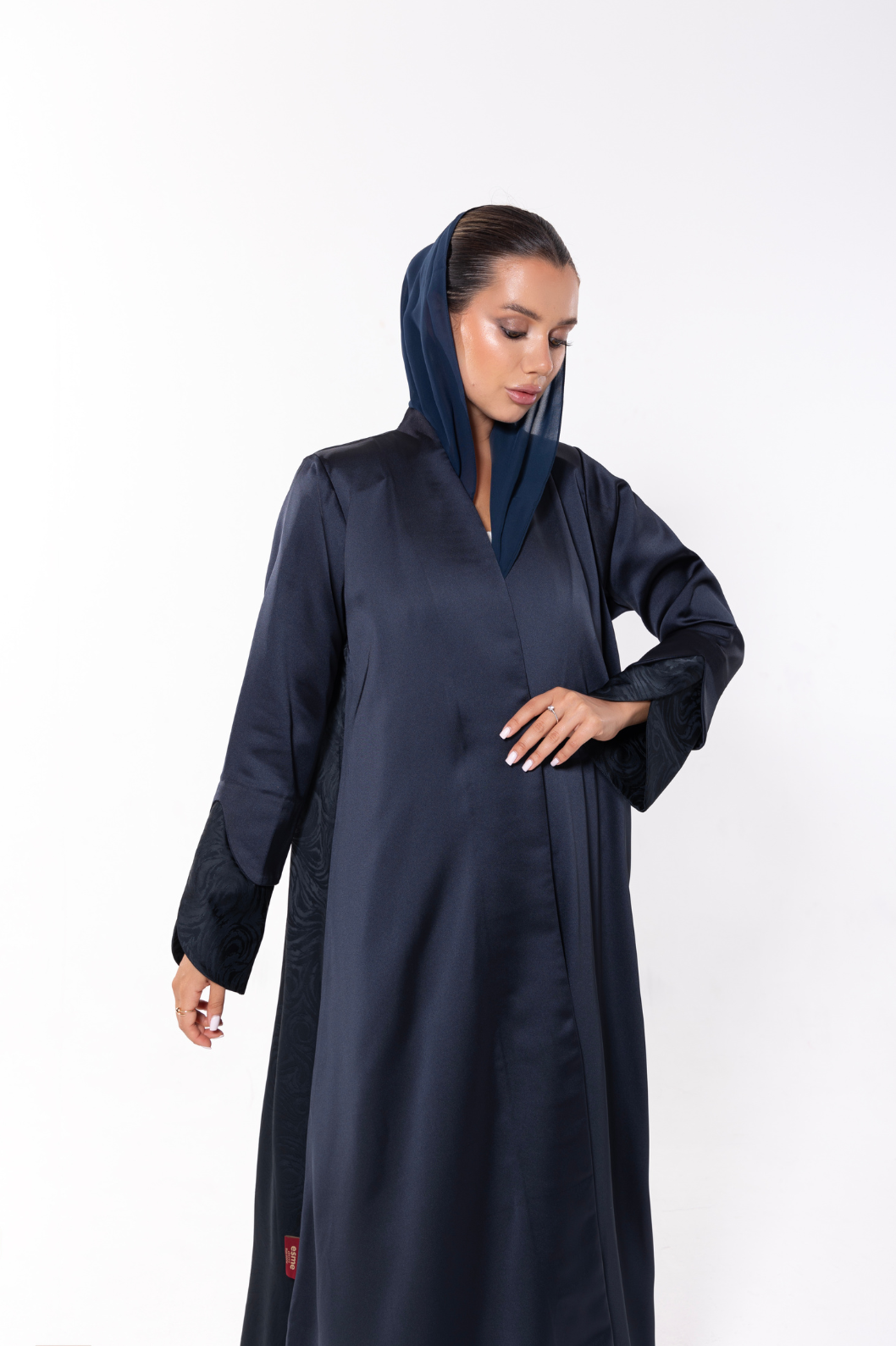 • Fabric: satin • Color: Satin Blue with soft sheen side panel • Details: Asymmetrical front panel, clean neckline, flowing drape • Includes: Matching sheila (headscarf) • Scented: Lightly perfumed