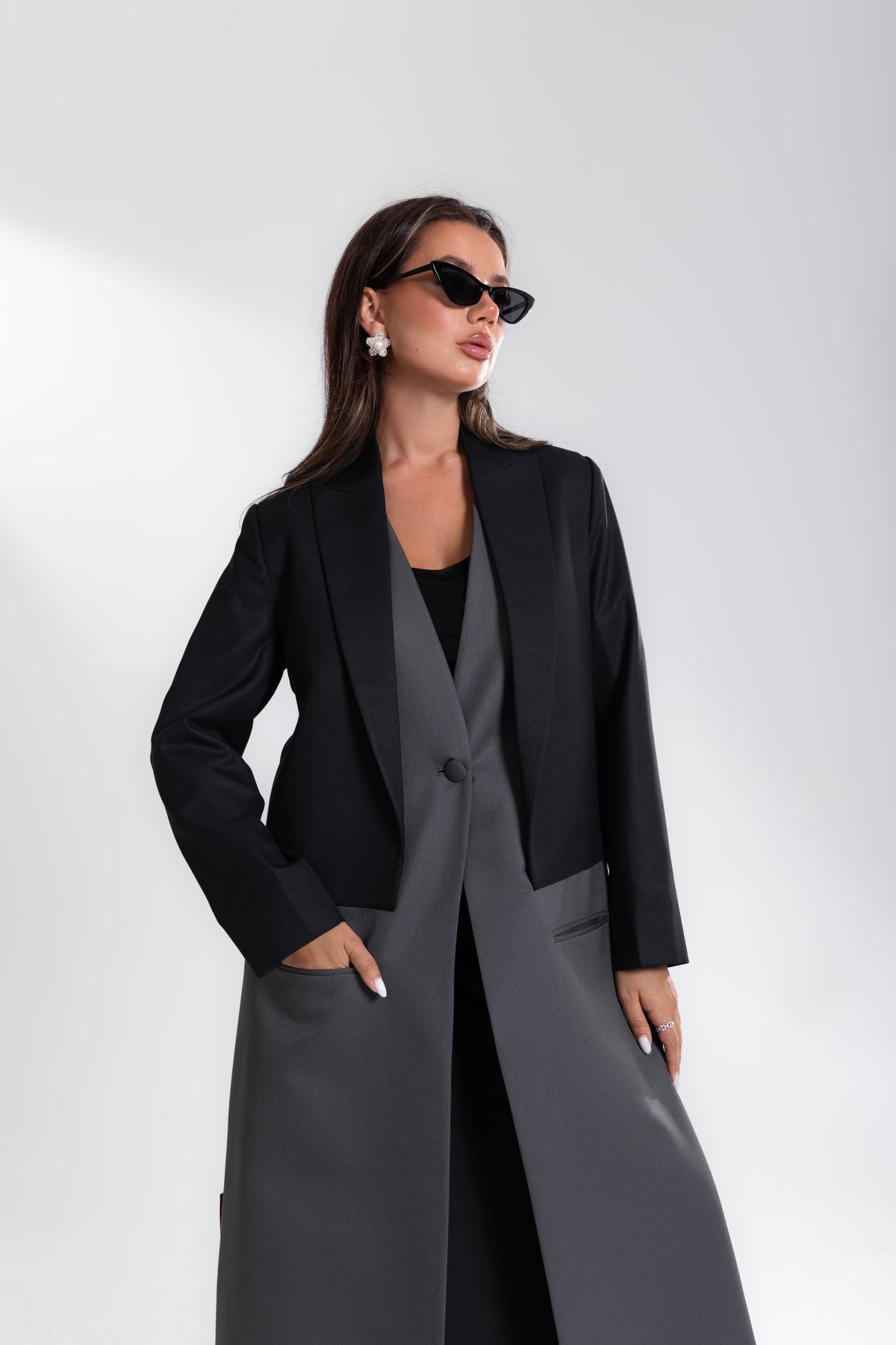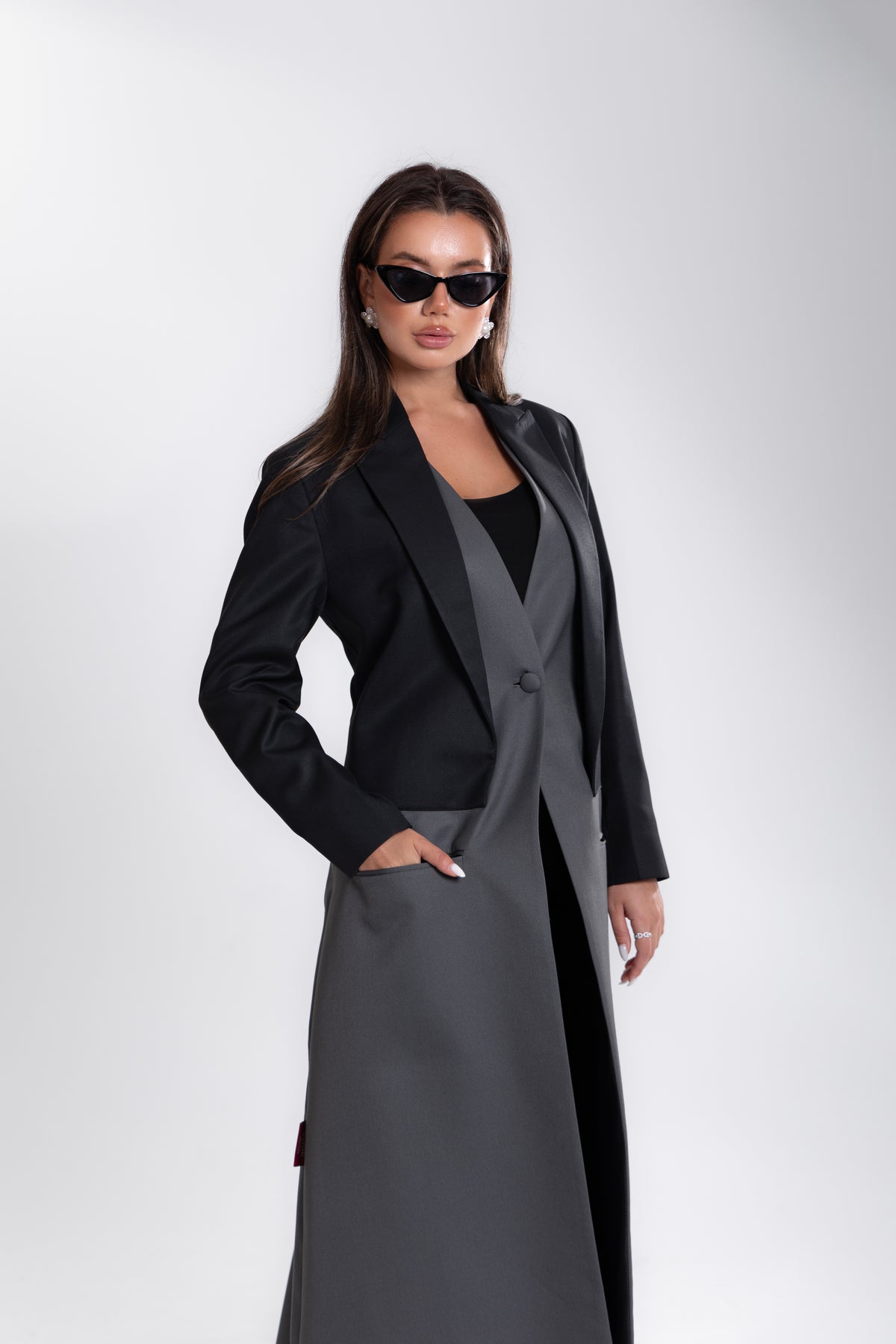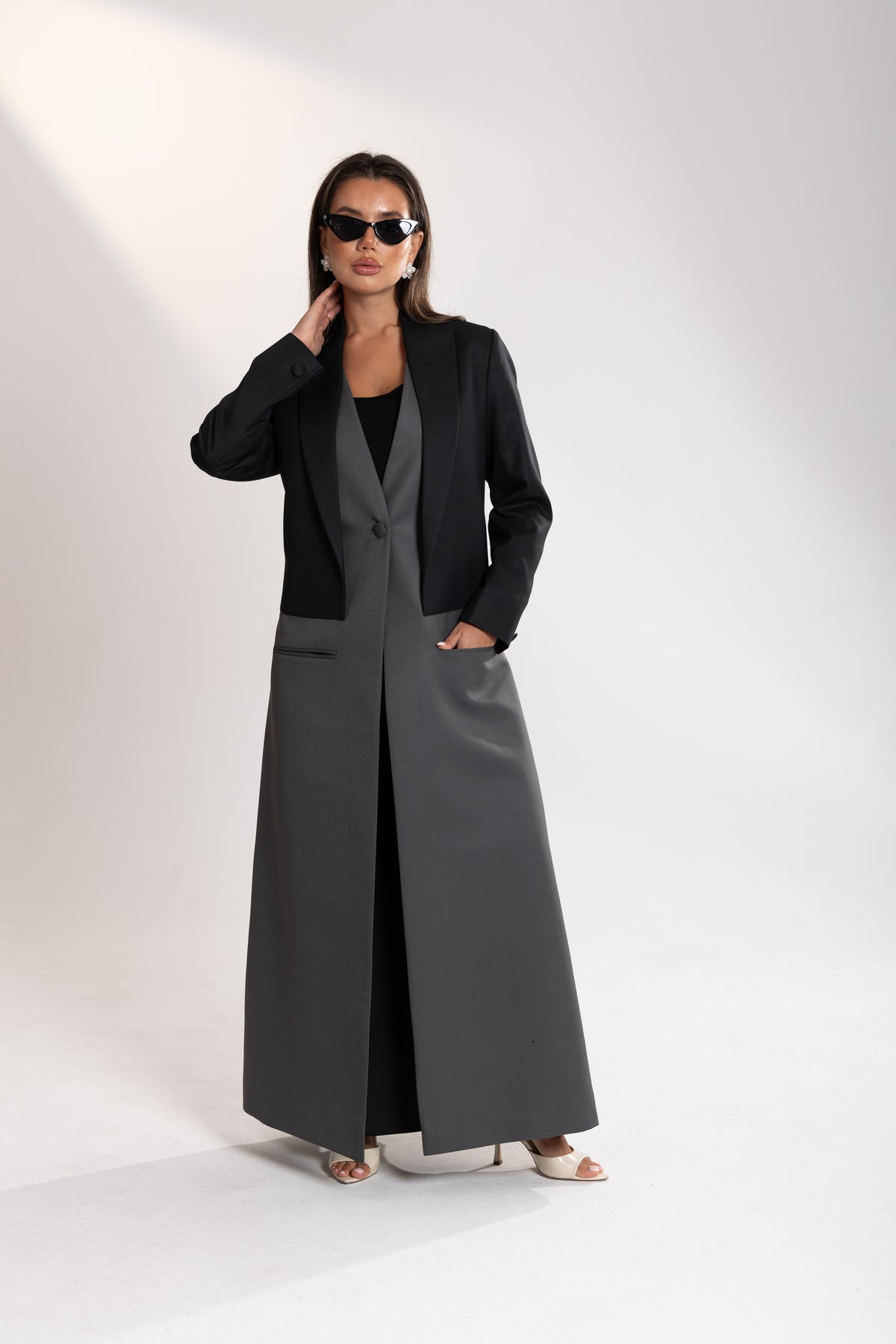 The Esme Twin Shadows Abaya is a sleek blazer-style design that harmoniously blends elegant shades of grey and black. Tailored to perfection, it embodies modern power, quiet confidence, and understated sophistication — the essence of Esme’s refined vision of modest luxury.